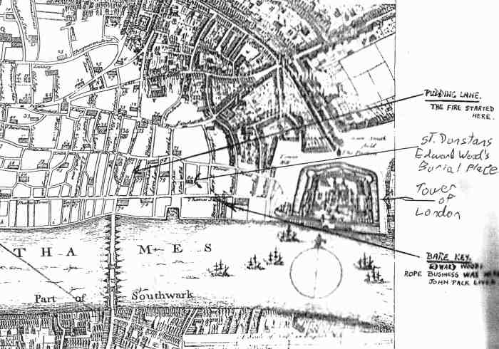 It seems surprising that Edward Wood was buried in London at St. Dunstan's, when this church had been partly destroyed by the Fire of London , and when Edward's last years had been devoted to building a new mansion in the country and acquiring land in that area. In his will, however, he shows that his main motive was a desire to be buried with his wife who had died in 1652. He left £50 to the poor of the parish of St . Dunstan's provided "that I may have at an indifferent vallue the same vault for a burying place for my selfe and family where my late deceased wife lyeth interred." He mentions elsewhere that this was "the new vault in the South Chappell" but it is important to note that this will was drawn up in 1658, before the Fire.
