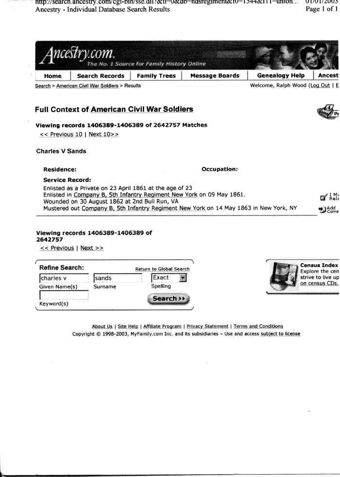 His mother is listed as having died in child birth but he claims his birthday was a few days before her death. Presumably, this means she did not die right away. Originally his full name was Charles Henry Sands (the middle name was presumably in honor of his grandfather, William Henry Harrison). His grandmother, Catharine (Van Alstyne) Harrison , apparently, took charge of raising him and his siblings after his mother's death. After his grandmother became widowed in 1838, she moved from Manhattan to Herkimer County, NY to be close to her daughter, Harriet (Harrison) Watson. She is listed, with three of Hart's five children, almost right next to Uri C. Watson and his wife, Harriet (Harrison) Watson in the 1840 census for German Flats, Herkimer Co., NY. Charles, apparently, changed his middle name to Van Altsyne in honor of his grandmother, who raised him. His civil war service record lists him as Charles V. Sands rather than Charles H. Sands and he maintained the middle initial "V." in his signature for the rest of his life. He enlisted in the 5th N.Y. Infantry, Company B (known as the Zouaves ) as a private on 4/ 23/1861. The Zouaves were an elite all vollunteer company, specializing in hand to hand combat. They went into battle wearing a uniform which included bright red pants and a turban. I am guessing that his first wife may have died prior to this enlistment but I have been unable to find a record of her death. He was wounded August 30, 1861 at 2nd Bull Run, Va . The Zouaves suffered the most casualties in the shortest time for any company of Union soldiers during the Civil War during that battle. For more on the Zouaves, see "Camp and Field Life of the Fifth New York Volunteer Infantry (Duryee Zouaves)" by Alfred Davenport . He was mustered out on May 14, 1863. In 1860 he was living with his first wife in the 10th ward of Manhattan. He was also counted in the 4th ward in the 1860 census. In 1850 he was living with "Catherine Sherman" in the 4th ward of Manhattan. This is, likely, his grandmother, Catherine (Van Alstyne) Sherwood. See her entry as to her remarriage to Seth Sherwood after the death of her husband, William H. Harrison. I suspect that Charles' return from Herkimer County was in order to apprentice with his brother, Edward, in the druggist trade. He lived with his first wife at 88 Chrystie after their marriage in 1860. At the time of his second marriage, in 1874, he was living in the Green Point section of Brooklyn. He picked up the druggist business at 71 James St. about 1859, from his brother Edward. In the 1890's and early 1900's he was a druggist in Brooklyn. His last business address was 1957 Dean.